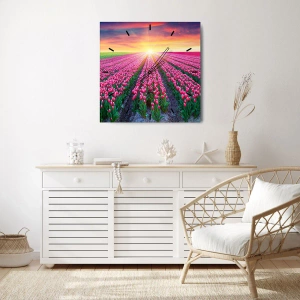 Nástěnné hodiny - Pole červených tulipánů při západu slunce - 30x30cm - Farma krásy - Moderní nástěnná dekorace do obývacího pokoje, kuchyně a ložnice ARTTOR