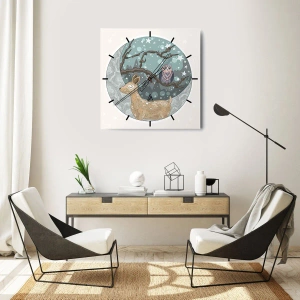 Nástěnné hodiny - Jelen a sova proti noční obloze - 30x30cm - Pohádková, lesní noc - Moderní nástěnná dekorace do obývacího pokoje, kuchyně a ložnice ARTTOR
