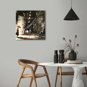 Kompozice, založená na monochromatických odstínech s červeným akcentem, vyjadřuje eleganci v jednoduchosti. Dešťové kapky a jemné odlesky vytvářejí pocit hloubky a dynamiky a dodávají interiéru jedinečnou atmosféru.