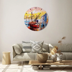- Tyto nástěnné hodiny zobrazují plachetnice v molu v záři zapadajícího slunce. Umělecký dotek, který vnese klid a teplo do každého interiéru.