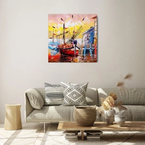 Nástěnné hodiny - Plachetnice na molu ve světle zapadajícího slunce - 30x30cm - Šťastný návrat - Moderní nástěnná dekorace do obývacího pokoje, kuchyně a ložnice ARTTOR