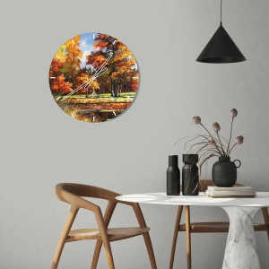 - Tyto nástěnné hodiny zobrazují podzimní les plný barevného listí a teplého světla. Jsou ideální pro milovníky přírody a malebné krajiny.