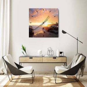 Nástěnné hodiny - Světelný večerní vánek - Západ slunce na pobřeží s kameny a teplým světlem