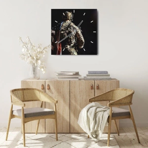 Nástěnné hodiny - Voják v uniformě s batohem a vlajkou na tmavém pozadí - 30x30cm - Právě proto - Moderní nástěnná dekorace do obývacího pokoje, kuchyně a ložnice ARTTOR