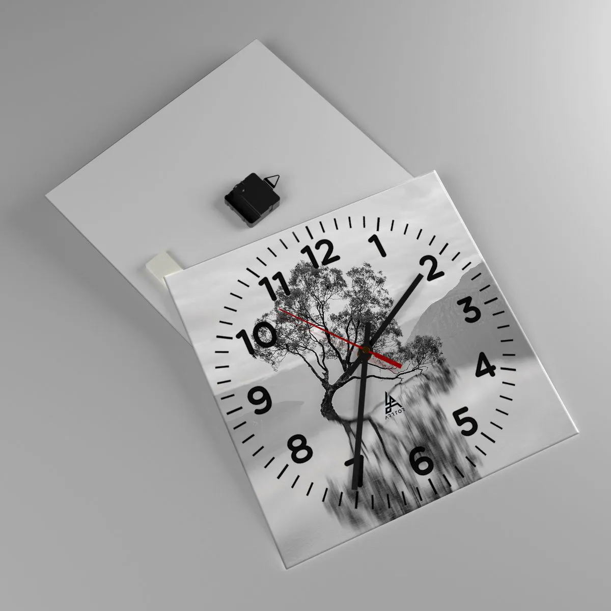 Hodiny jsou vyrobeny z bezpečného tvrzeného skla o tloušťce 4mm. Technologie výroby hodin je v souladu s třídou bezpečnosti 2B2 podle normy PN-EN 12600:2004, která garantuje odolnost proti nárazům. Hodiny na skle jsou připravené k zavěšení – mají kovový závěs upevněný na zadní částí hodin a pěnovou distanční podložku, která upravuje vzdálenost hodin od zdi. Hodiny mají tichý plovoucí mechanismus napájený 1,5V baterií - AA baterie (baterie není součástí balení).