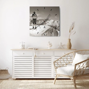 Nástěnné hodiny - Lyžař na pozadí zasněžených hor v retro stylu - 30x30cm - Stejné hory - Moderní nástěnná dekorace do obývacího pokoje, kuchyně a ložnice ARTTOR
