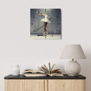 "Baletka v bílých šatech" jsou unikátní nástěnné hodiny, které kombinují eleganci baletního umění s industriální atmosférou. Zobrazují baletku v klasických bílých šatech, zobrazenou v dynamické póze na pozadí surové betonové zdi. Tato kombinace kontrastních prvků vytváří moderní a expresivní design.