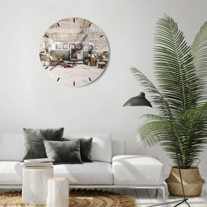 - Obraz zobrazuje obytný vůz na pozadí přírodní krajiny s boho interiérovými prvky. Skleněné hodiny o rozměrech 30x30 cm dokonale kombinují motiv cestování s přírodou.