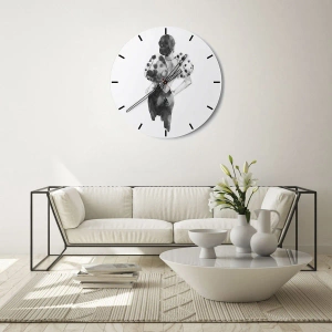 - Kulaté skleněné hodiny o rozměrech 30x30 cm s černobílým obrázkem ženy v elegantních šatech, ideální do moderního i minimalistického interiéru.
