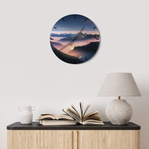 • Nástěnné hodiny s výhledem na horskou krajinu za soumraku, s údolím plným světla a mlhy. Malebná scenérie plná klidu, prostoru a kouzla přírody.