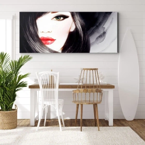 Detaily obličeje, jemně zdůrazněné řasy, jemné obočí a intenzivní rudé rty vytvářejí portrét plný emocí a výrazu. Obraz se perfektně hodí do moderních, minimalistických nebo okouzlujících interiérů a dodává mu sofistikovaný charakter.