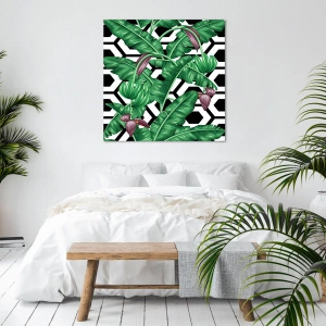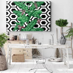 Plátno „Tropické listy na geometrickém pozadí“ je unikátní kombinací přírodních motivů a moderních vzorů. Ústředním prvkem kompozice jsou zelené tropické banánové listy, které kontrastují s černobílým geometrickým pozadím. Tento výrazný kontrast činí obraz poutavým a dodává prostoru jedinečný charakter.