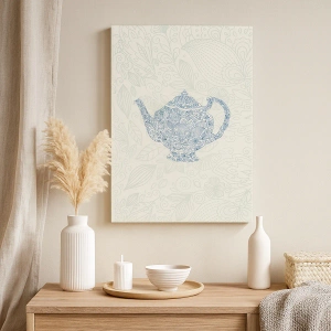 - Obraz zobrazuje zdobenou konvici na čaj s modrými ornamenty na jemném vzorovaném pozadí. Je perfektní jako dekorace do kuchyně nebo obývacího pokoje a dodá každému interiéru eleganci a vintage kouzlo.