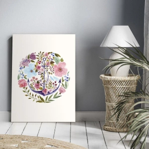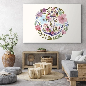 Nástěnné umění - Námořníkův dobrý sen - Kotva obklopená květinami v akvarelovém stylu na světlém pozadí