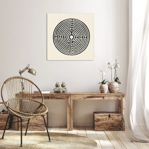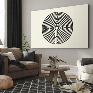 - Tento obraz zobrazuje černobílý kruhový labyrint na světlém pozadí. Minimalistická dekorace, která vnáší harmonii, řád a inspiraci do každého interiéru.