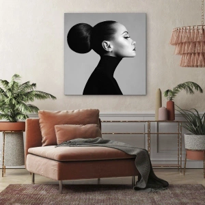 - Tento černobílý obraz zobrazuje ženský profil s elegantním drdolem. Je to perfektní volba pro milovníky minimalistického a stylového interiérového designu.