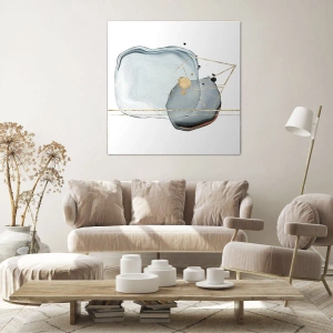 - Obraz zobrazuje abstraktní tvary v odstínech modré a zlaté na bílém pozadí. Minimalistická dekorace, která vnáší jemnost a eleganci do každého interiéru.