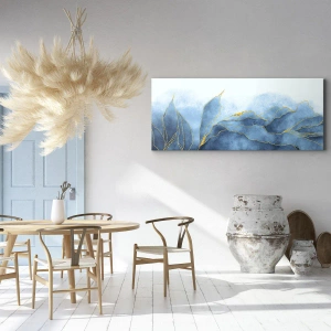 - Obraz s abstraktními vlnami v odstínech modré s jemnými zlatými akcenty, ideální do moderních interiérů.