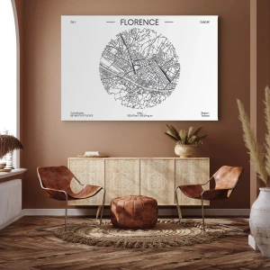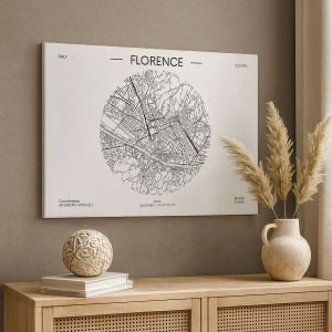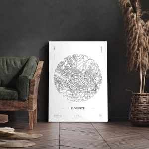 Kompozice obrazu představuje detailní rozložení ulic a čtvrtí města, což z něj činí nejen dekorativní prvek, ale také inspiraci k cestování a objevování bohaté historie Florencie. Výrazné kontrasty mezi bílým pozadím a černými čarami dodávají harmonii a klid každému interiéru.
