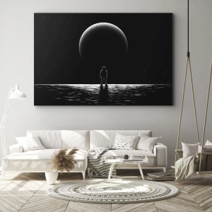 - Obraz „Tváří v tvář“ zobrazuje astronauta stojícího na pozadí rozlehlé planety ve vesmíru, vykresleného v černé a bílé barvě. Obraz má rozměry 70x50 cm v krajinném formátu a je ideální pro moderní a minimalistické interiéry.