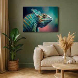 - Plátnový obraz s chameleonem v zářivě zelené a oranžové barvě. Výrazná a exotická kompozice, ideální do moderních interiérů.