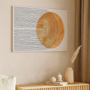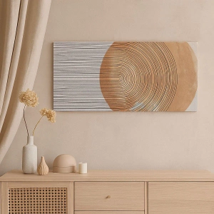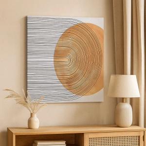 - Plátnový tisk s geometrickou kompozicí kruhů a čar v teplých barvách. Ideální do moderních interiérů, dodává harmonii a estetický akcent.