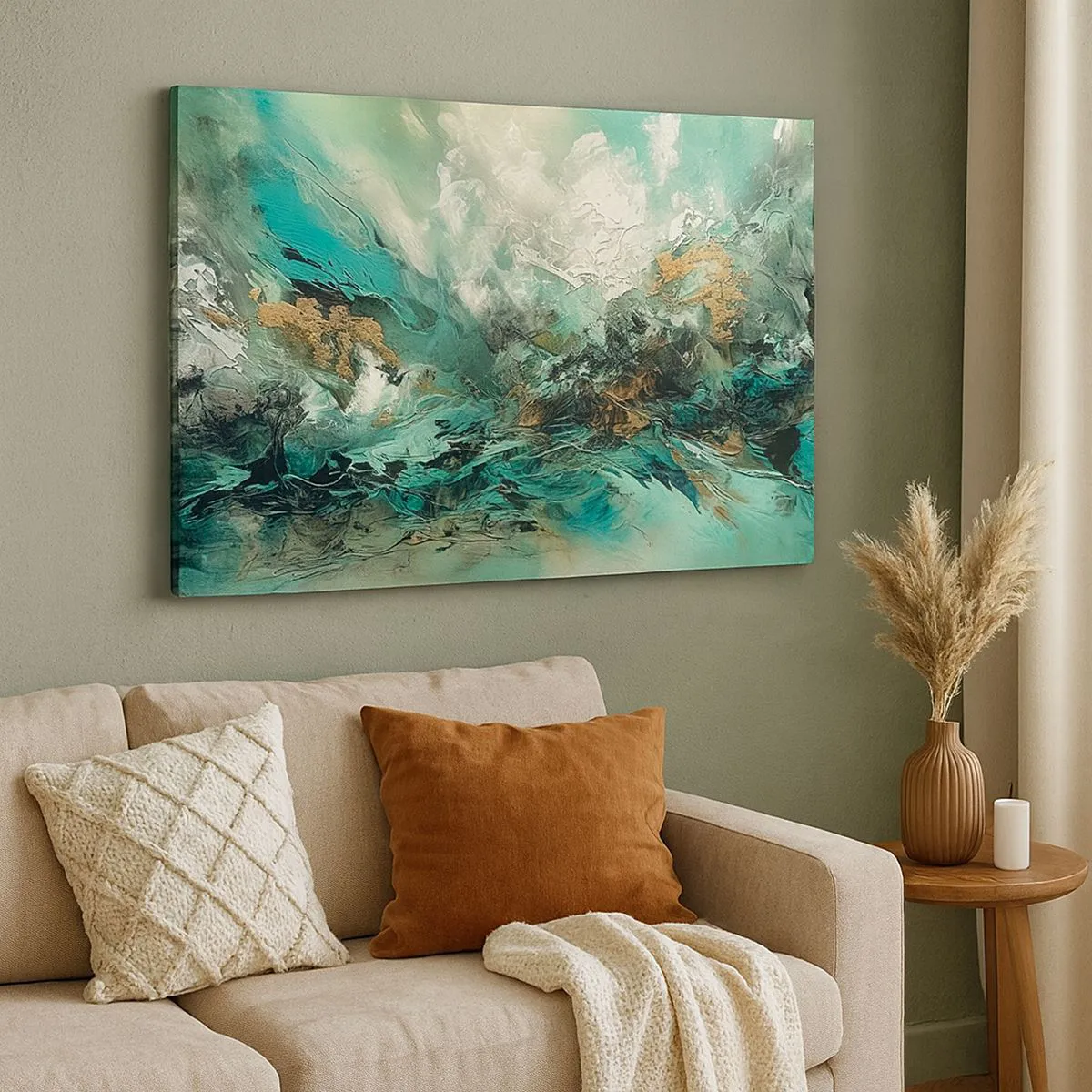 Nástěnný obraz - Smaragdově černý příboj - Abstraktní krajina v odstínech zelené a zlaté