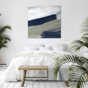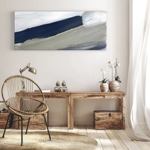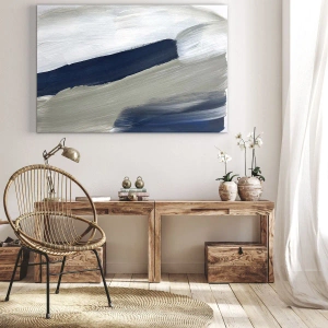 - Tento plátěný obraz o rozměrech 70x50 cm zobrazuje abstraktní tahy štětcem v odstínech modré a šedé. Je ideální do moderních interiérů, přináší harmonii a jemný umělecký výraz.