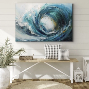 Plátno „Mořský portál“ je unikátní dekorace, která potěší svou dynamickou kompozicí a intenzivními barvami. Hlavní část obrazu zobrazuje silnou, vířivou vlnu v odstínech modré a tyrkysové, která jako by oživila a vnesla pohyb do jakéhokoli prostoru.