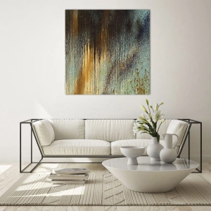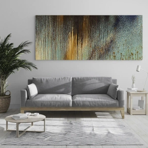 Obraz zobrazuje vertikální proudy barvy, které stékají shora dolů a kontrastují s cákanci a rozmazáním. Zlaté prvky přitahují pohled a osvětlují celek, čímž vytvářejí auru luxusu a moderní elegance. Toto dílo je ideální pro prostory, které potřebují výrazný akcent – od moderních obývacích pokojů až po stylové kanceláře.