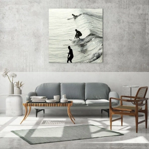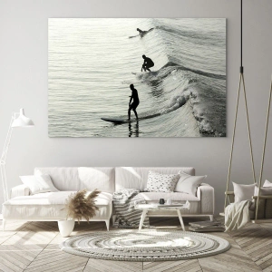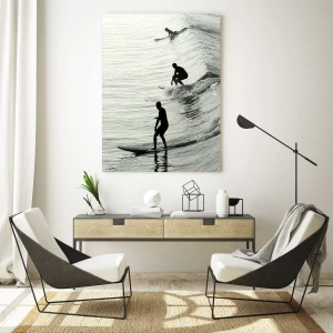 Skleněný obraz „Setkání s vlnou“ je dynamická a energická scéna zobrazující tři surfaře jedoucí na oceánských vlnách. Černobílá estetika rámu umožňuje soustředit se na formu, pohyb a hru světla na vodní hladině. Kontrastní siluety sportovců jasně vynikají na pozadí jemně se vlnícího oceánu a vytvářejí vizuální harmonii a zároveň napětí.