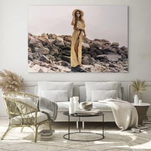 Obraz "Magie kamenů" je unikátní kompozice, která spojuje ženskou eleganci se smyslností přírody. V popředí vidíme stylovou ženu oblečenou v dlouhých, splývavých šatech v odstínech žluté s jemným páskem v pase. Klobouk a tmavé sluneční brýle doplňují její letní outfit v duchu boho stylu, který zdůrazňuje uvolněnost, svobodu a blízkost přírodě. Ženská postava je zobrazena na pozadí skalnatého pobřeží, což vytváří kontrast mezi jemností siluety a drsností okolí.