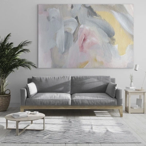 - Obraz zobrazuje abstraktní kompozici vytvořenou jemnými tahy štětcem v pastelových odstínech růžové, béžové a šedé. Harmonická souhra barev evokuje pocit klidu a jemnosti. Ideální pro moderní a ženské interiéry.