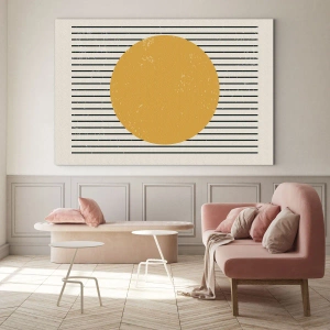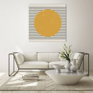 Skleněný umělecký tisk „Síla jednoduchosti“ je minimalistická grafická kompozice zobrazující oranžový kruh v systému vodorovných černých čar. Béžové pozadí doplňuje harmonii a vytváří minimalistický, ale zároveň expresivní umělecký tvar.