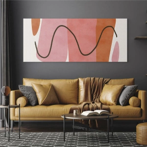 Obraz na skle - Abstraktní tvary v růžové a oranžové barvě s černou linkou - 70x50cm - Jemný pohyb forem - Moderní nástěnná dekorace do obývacího pokoje a ložnice ARTTOR