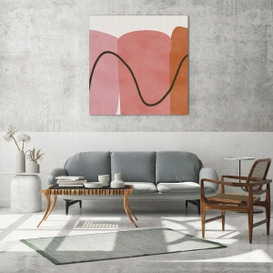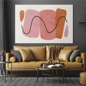 - Obraz zobrazuje abstraktní, měkké tvary v odstínech růžové a oranžové, protínané vlnitou černou linií. Kompozice zaujme svou jednoduchostí a jemným pohybem forem.