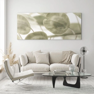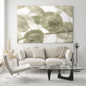 - Detailní záběr na jemné, průsvitné listy v pastelových odstínech zelené. Tento harmonický a světlý obraz dokonale doplní světlé, přírodní interiéry.