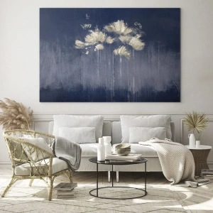 - Umělecká interpretace květin ve zlatých odstínech na tmavě modrém pozadí. Obraz kombinuje abstraktní formu s jemností a elegancí a dokonale doplňuje interiéry s jemným, moderním nádechem.