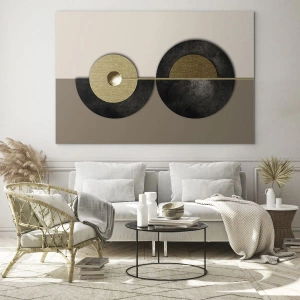- Obraz zobrazuje dva geometrické kruhové tvary se zlatými a černými plochami, umístěné na béžovém pozadí. Kompozice je pozoruhodná svou jednoduchostí a elegancí a vytváří harmonický a moderní efekt.