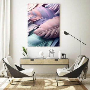 - Obraz zobrazuje jemná, pastelová peří v odstínech růžové, fialové a tyrkysové. Tato lehká, romantická kompozice vnáší do interiéru jemnost, barvu a smyslný nádech.