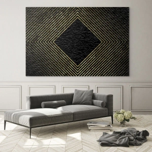 Kontrast zlaté a černé zdůrazňuje exkluzivní charakter obrazu, odkazující na styly glamour a art deco. Zlaté linie definují jasnou geometrickou strukturu, jejíž dokonalá symetrie vytváří rytmus a řád. Obraz vyzařuje klid a noblesu a zároveň poskytuje silný vizuální ústřední bod, který dokáže definovat celý interiérový design. Je to volba pro ty, kteří hledají moderní a expresivní dekorace s nádechem elegance.