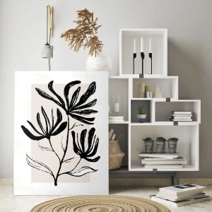 Dominantními barvami jsou černá a béžová, které dokonale zapadají do minimalismu. Rostlinný motiv je prezentován volným a přirozeným způsobem, jako by byl načrtnut inkoustem na papíře, což zdůrazňuje umělecký charakter kompozice. Díky tomuto stylu je obraz ideální pro interiéry s klidným, tlumeným dekorem.
