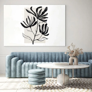- Obraz zobrazuje černou skicu stylizované rostliny se třemi květy na světlém pozadí. Minimalistická kompozice ideální pro moderní interiéry ve skandinávském nebo japonském stylu.
