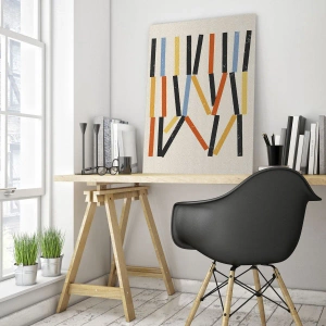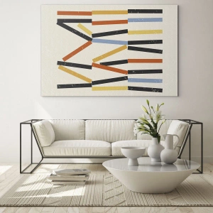 • Obraz představuje abstraktní kompozici horizontálních a diagonálních pruhů v různých barvách na světlém pozadí. Jeho moderní geometrický tvar je ideální pro minimalistické a designové interiéry.
