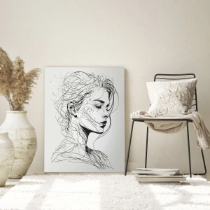 - Obraz zobrazuje jemnou černobílou skicu ženy se zavřenýma očima, provedenou jemnou linií. Minimalistická forma a jemný výraz vytvářejí atmosféru ticha a zamyšlení.