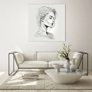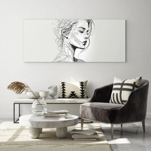 Obraz na skle - Černobílá skica ženy se zavřenýma očima v jemné linii. - 70x50cm - Portrét v zamyšlení - Moderní nástěnná dekorace do obývacího pokoje a ložnice ARTTOR