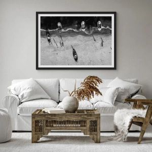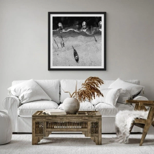 Plakát v černém rámu - Černobílý letecký snímek lodi na pláži - 50x70cm - Ještě na břehu… - Moderní nástěnná dekorace do obývacího pokoje a ložnice ARTTOR