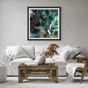 Plakát v černém rámu - Zelené listy a zlaté akcenty na tmavém pozadí - 50x70cm - Kouzelná zahrada - Moderní nástěnná dekorace do obývacího pokoje a ložnice ARTTOR