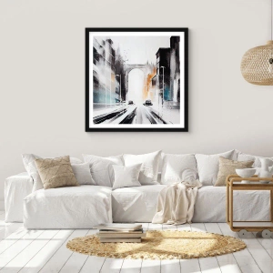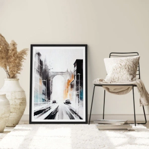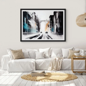 Plakát v černém rámu - Abstraktní panorama města s monumentálním obloukem - 50x70cm - Studie města: architektura a pohyb - Moderní nástěnná dekorace do obývacího pokoje a ložnice ARTTOR
