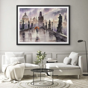 - Plakát zobrazuje malebný most v deštivý den s postavou nesoucí červený deštník, která se prochází po mokrém povrchu. Jemné akvarelové odstíny dodávají scéně romantický a nostalgický nádech.